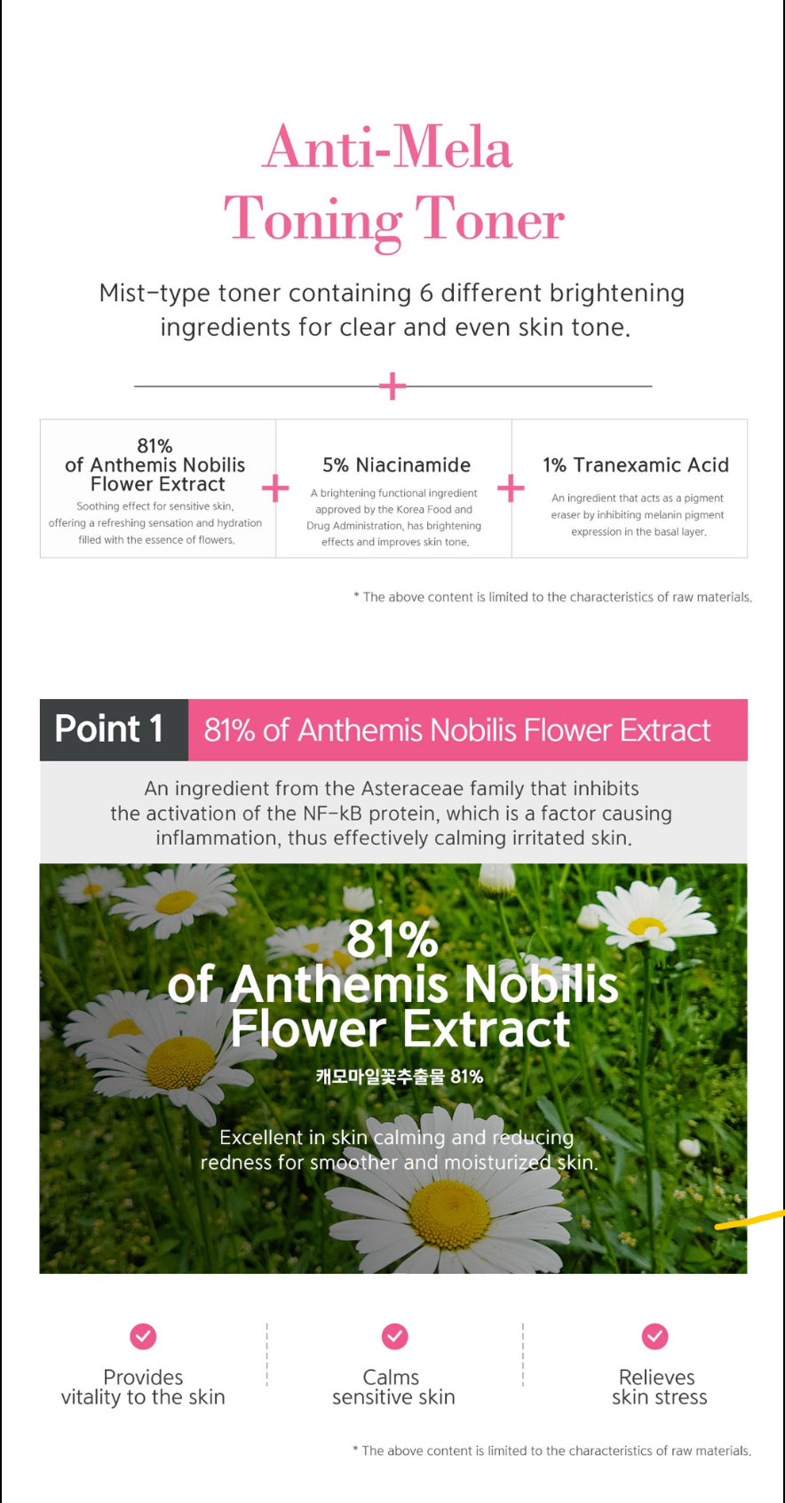 A jelly textured, mist - type toner that brightens dull and uneven skin tone with highly concentrated niacinamide , tranexamic acid , and glutathione , and calms sensitive skin with 81% of chamomile flower extract to make skin clear and healthy.