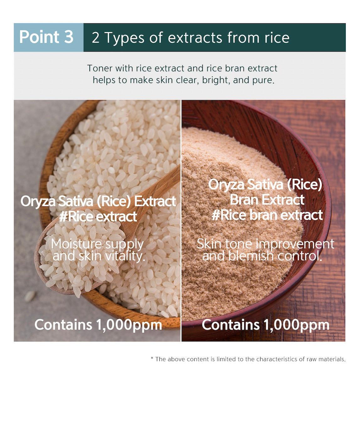 Two types of extracts from rice. Toner with rice extract and rice bran extract helps to make skin clear, bright, and pure.