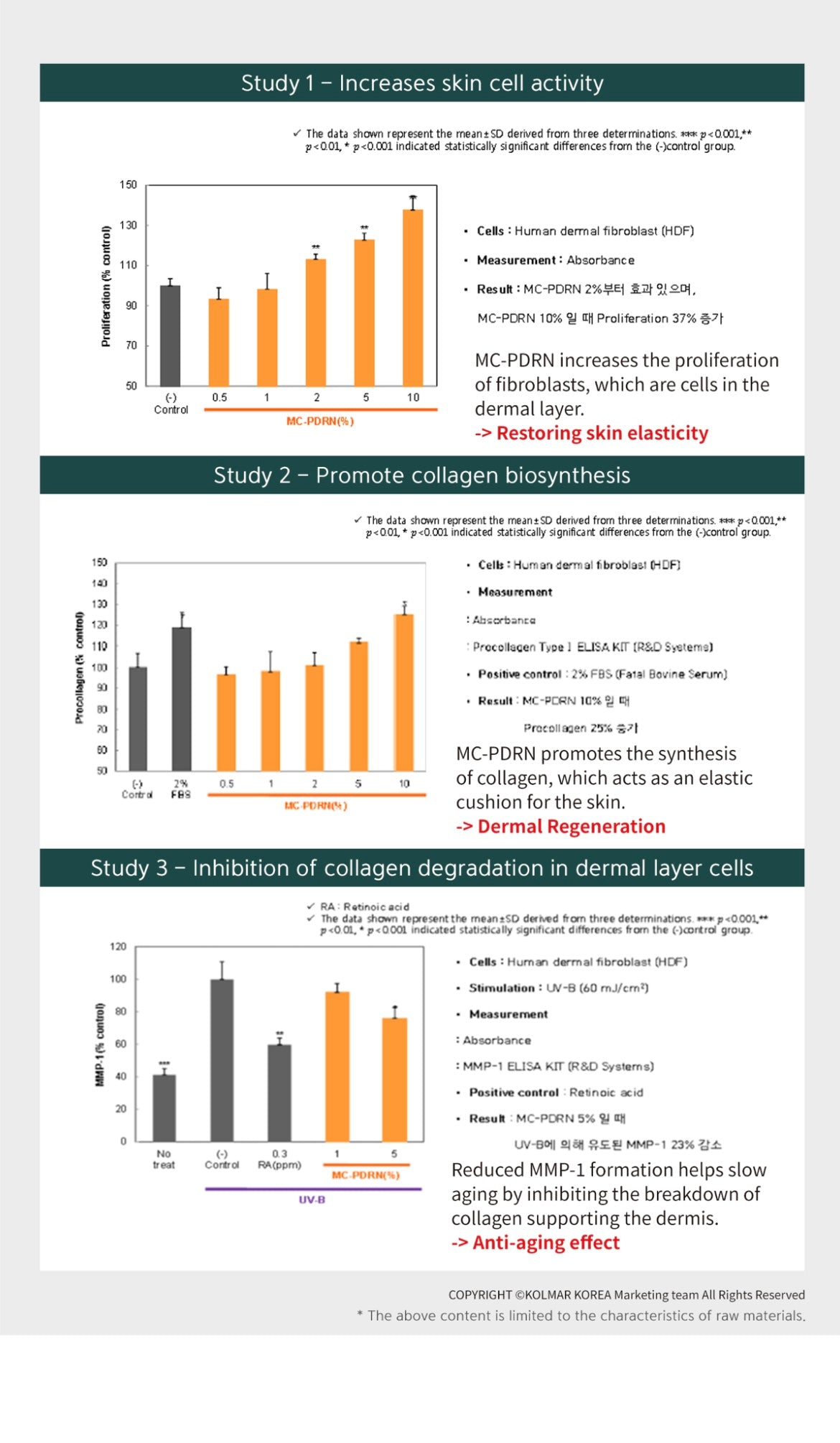 PDRN (Sodium DNA) is effective for repairing and rapid cell regeneration of damaged issues, and it provides nutrition, moisture, and elasticity to the skin as well as the formation of a protective layer on the aged skin.
