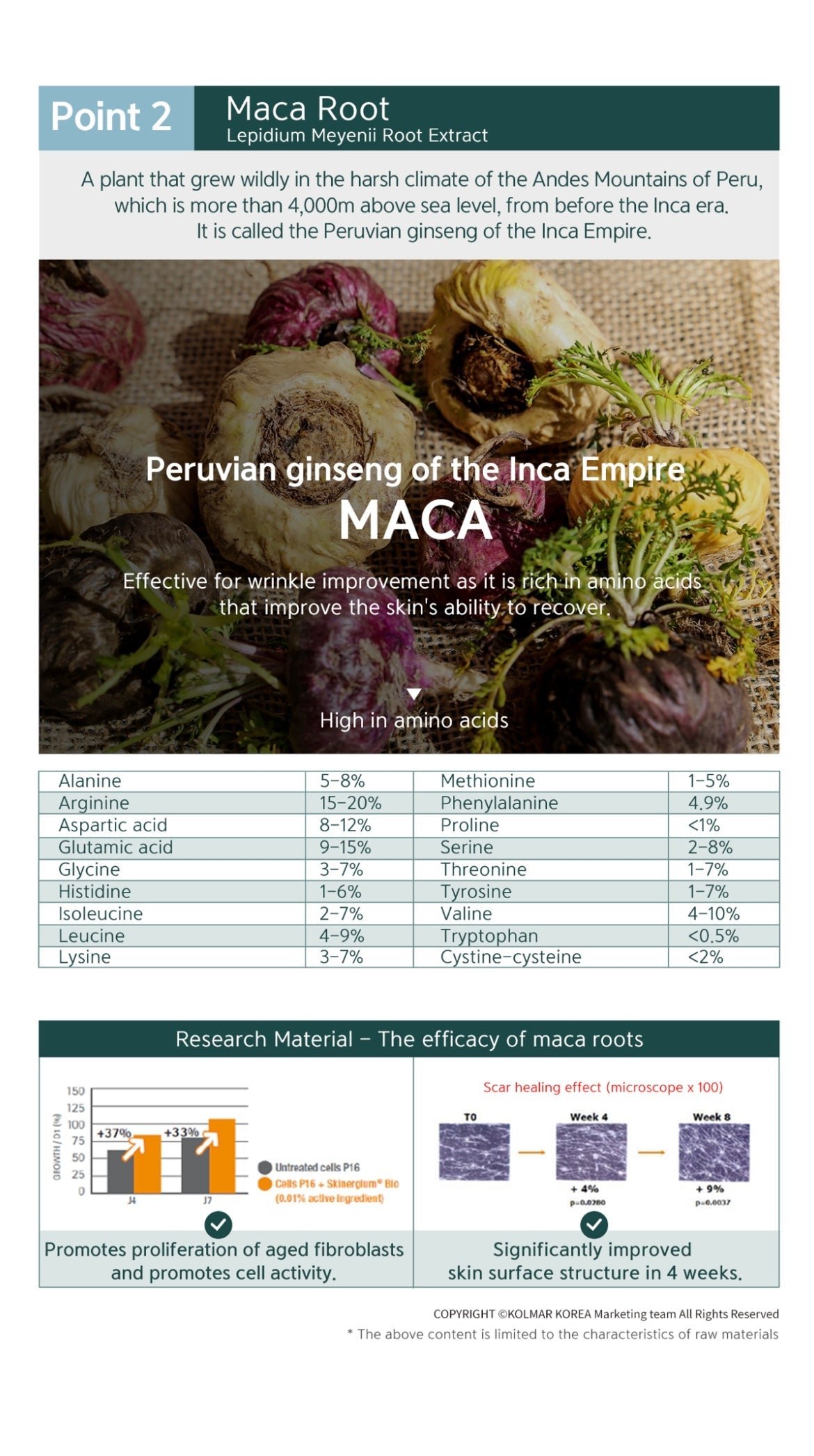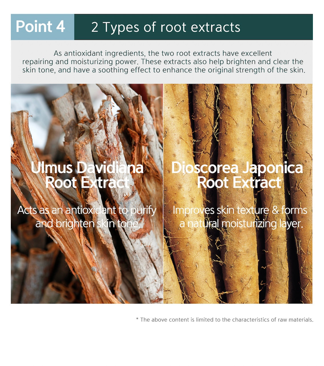 Two types of root extracts. As antioxidant ingredients, the two root extracts have excellent repairing and moisturizing power. These extracts also help brighten and clear the skin tone, and have a soothing effect to enhance the original strength of the skin.