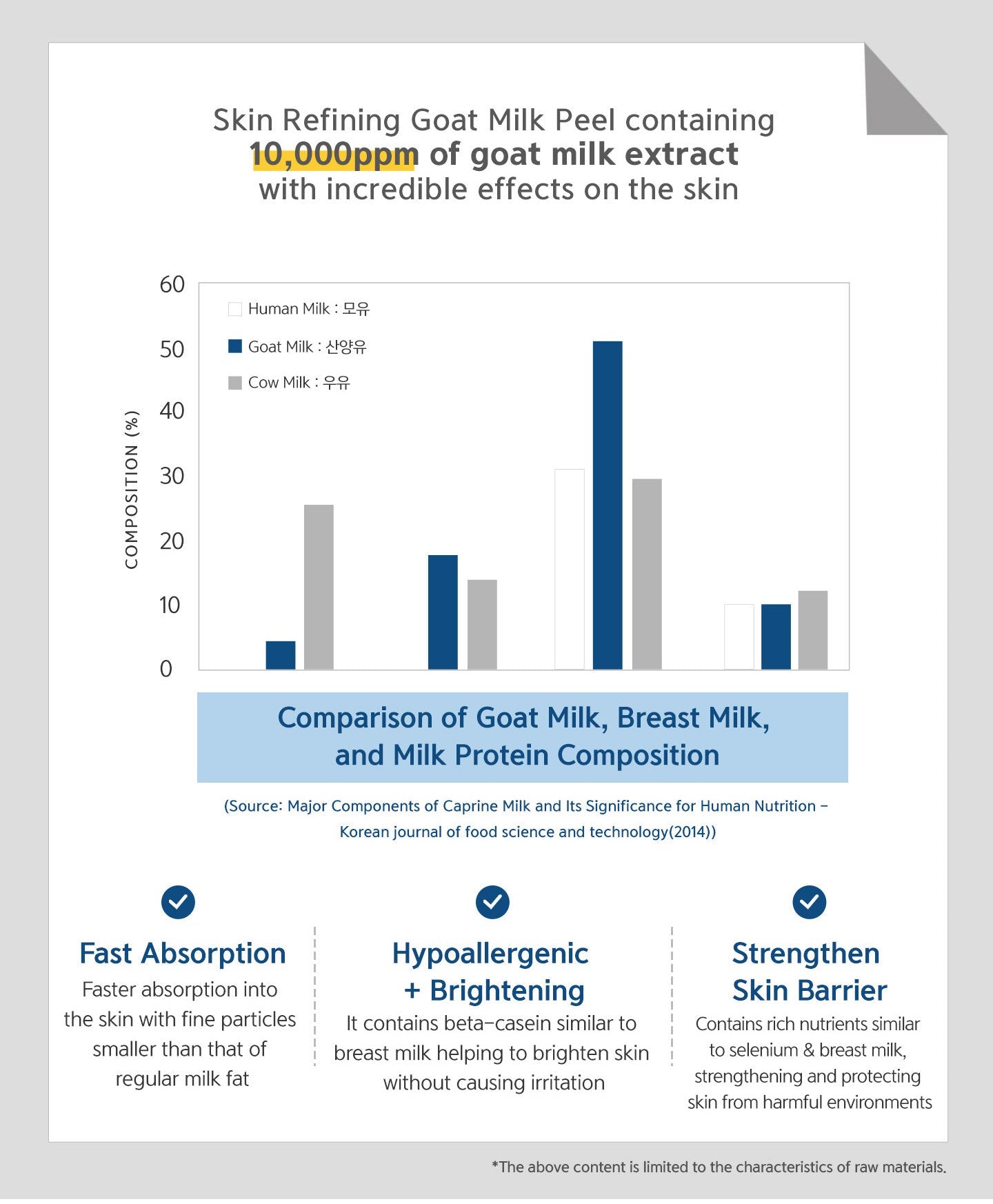Hypoallergenic and extra moisturizing goat milk peel with the golden ratio of AHA, BHA, and PHA and 7500 ppm of goat milk extract to brighten skin complex.